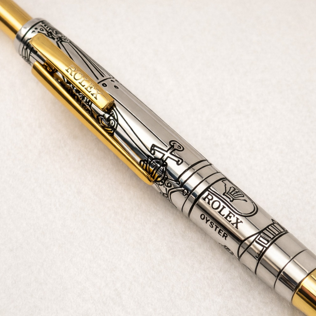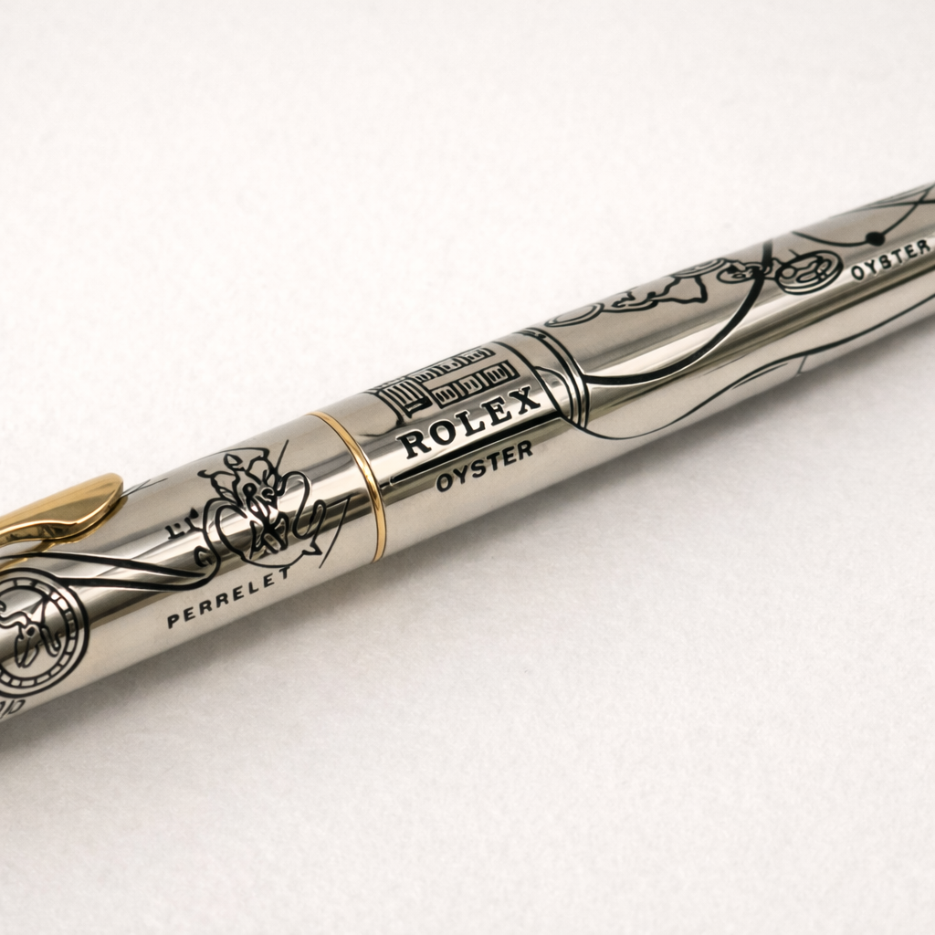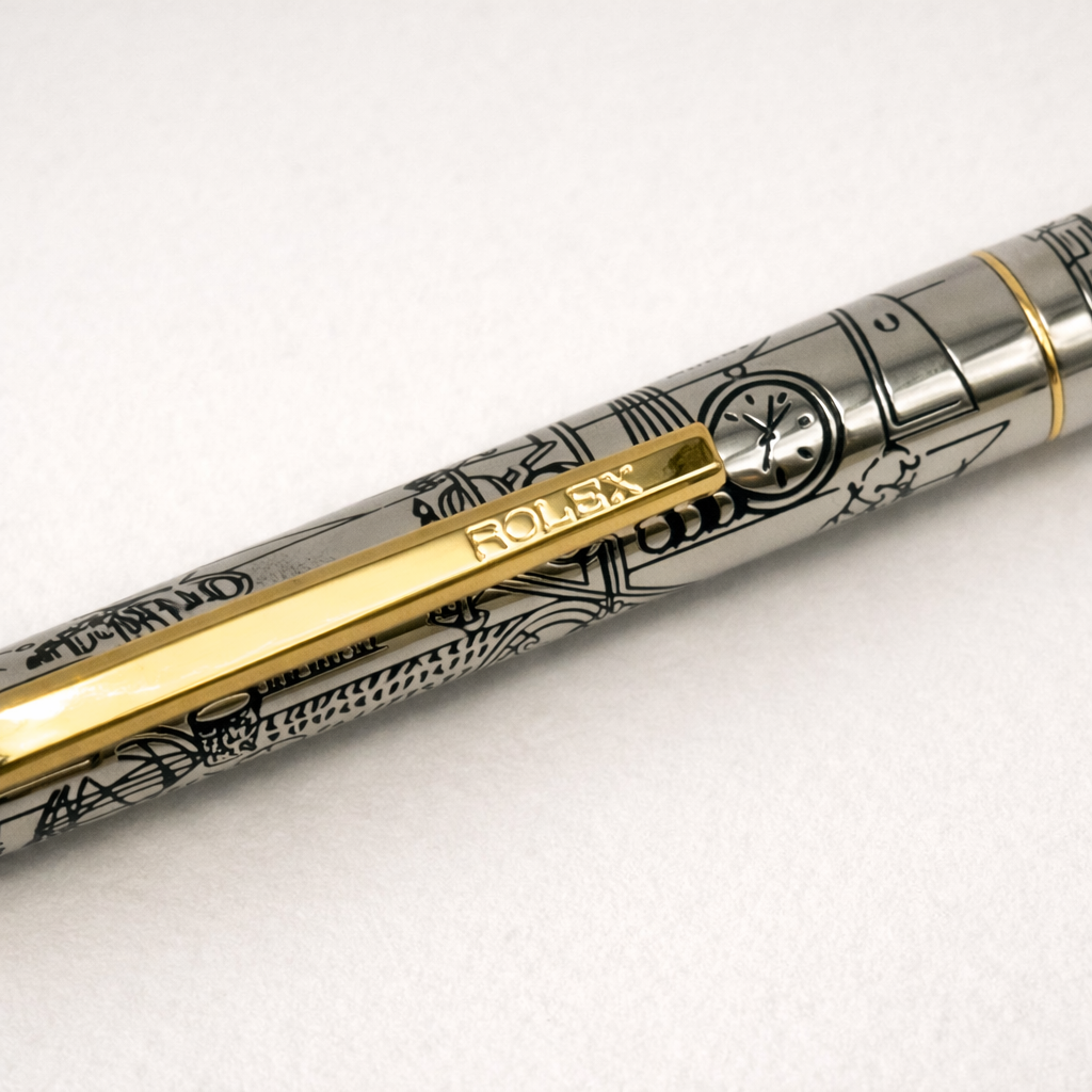 An uncommon Rolex authorized dealer gift featuring detailed illustrated engravings across the barrel, combining horological motifs with a refined silver and gold finish. These pens were produced in limited quantities for Rolex boutiques and special clients, making them highly collectible accessories for enthusiasts and collectors.