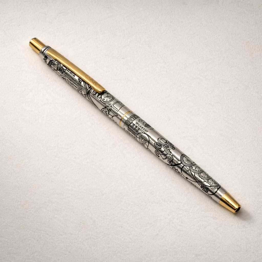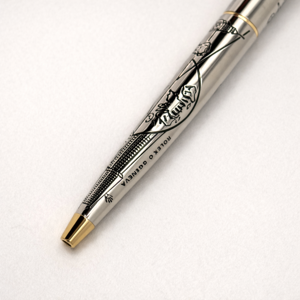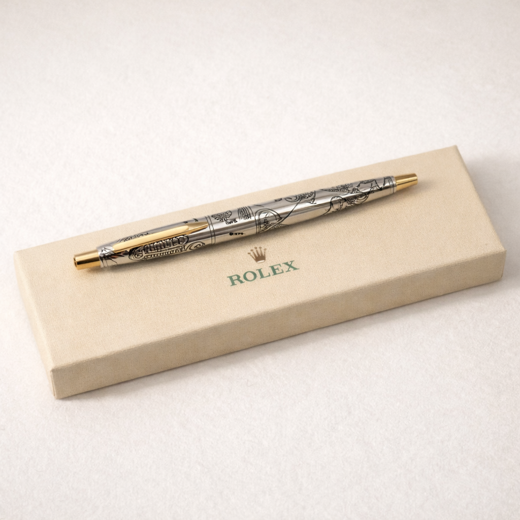 An uncommon Rolex authorized dealer gift featuring detailed illustrated engravings across the barrel, combining horological motifs with a refined silver and gold finish. These pens were produced in limited quantities for Rolex boutiques and special clients, making them highly collectible accessories for enthusiasts and collectors.